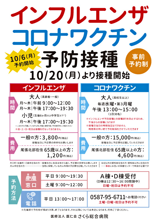 インフルエンザ・コロナワクチンともに10/20(月)より接種を行ないます。